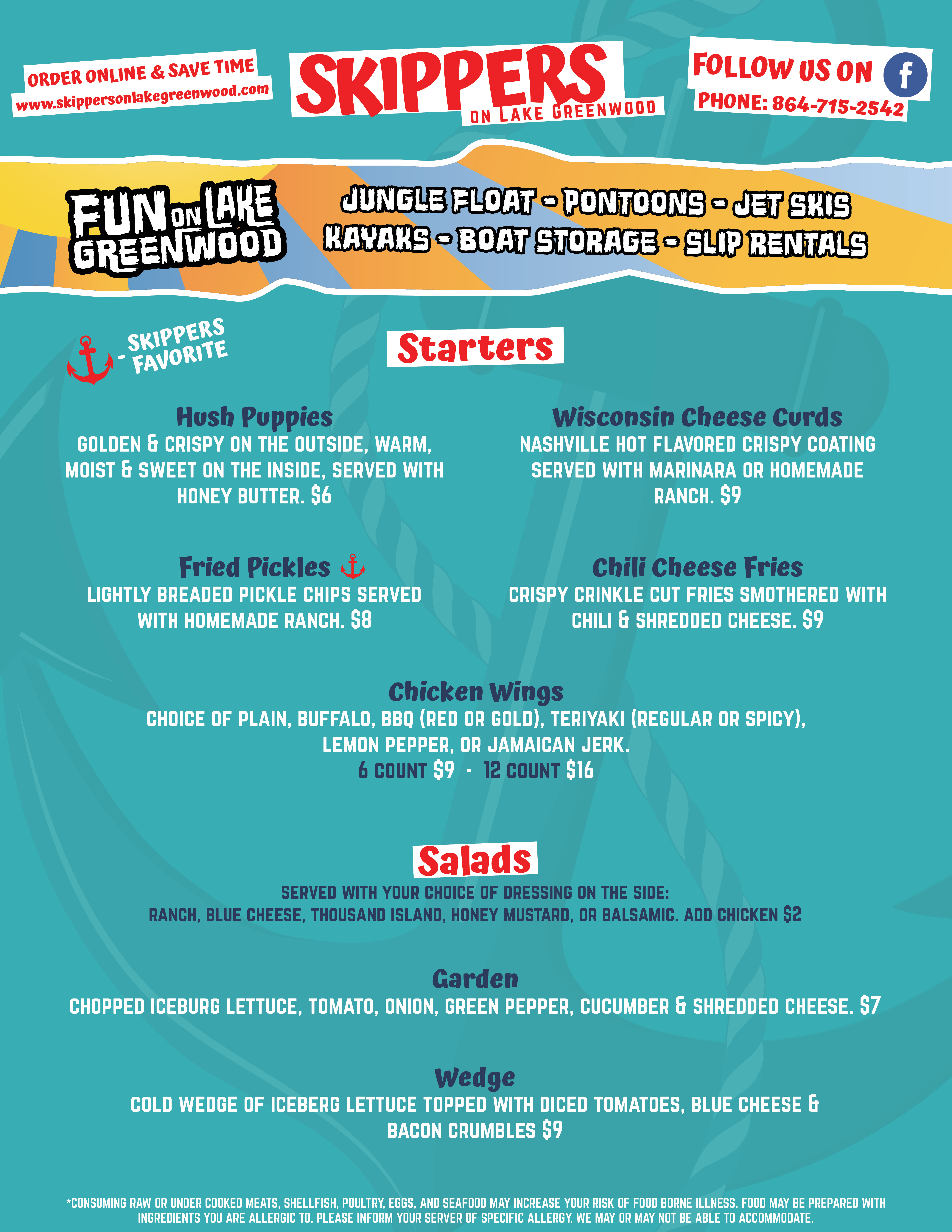Menu items and specials may vary by season. For the latest offerings, daily specials, and updates follow us on Facebook or give us a call at (864) 715-2542.