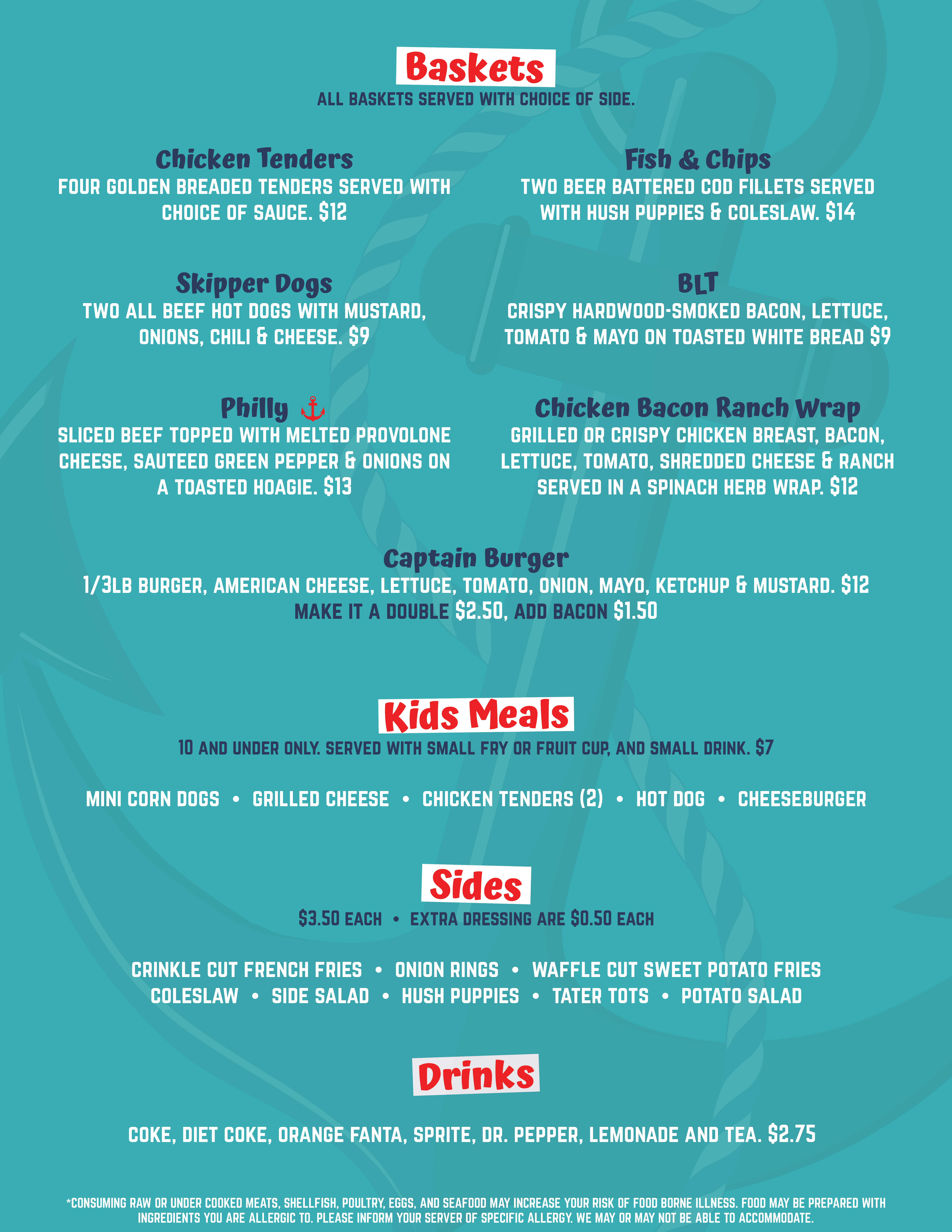 Enjoy a meal on the lake. Order online for take-out or check our Facebook for daily specials.